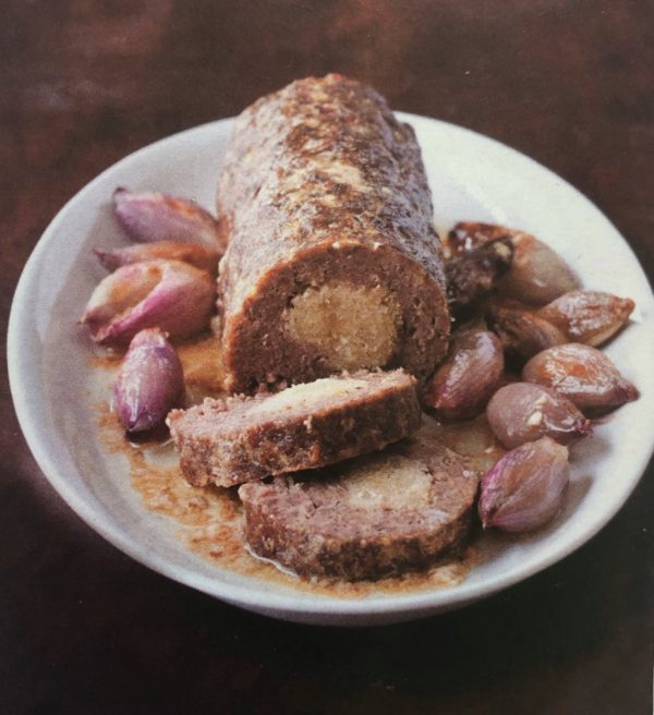- Maso prohněteme se solí, majoránkou, 1 vejcem, utřeným česnekem a strouhankou. Pak ho rozprostřeme na potravinářskou fólii do obdélníku. Do středu dáme zelí a pomocí fólie zabalíme do válce. Ze všech stran uhladíme, dáme do pekáčku vytřeného sádlem, potřeme bílkem, podlijeme vodou a kolem rozprostřeme šalotku. Podléváme a pečeme cca hodinu při 180°C,