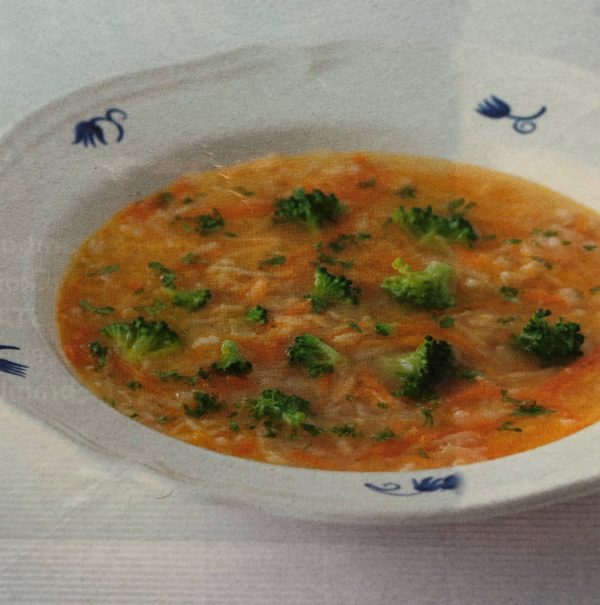 - Na másle zpěníme nadrobno nakrájenou cibuli, přidáme vločky a za stálého míchání lehce opražíme. Přidáme nastrouhanou mrkev, petržel, celer a zalijeme horkým vývarem. Zhruba 10 minut povaříme a přidáme brokolici. Znovu krátce povaříme, podle chuti dosolíme a podáváme ozdobené petrželkou.