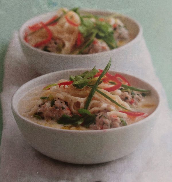 - Maso promícháme s polovinou jemně nasekaných cibulek, 1 nasekanou chilli papričkou, nasekaným koriandrem, polovinou nastrouhaného zázvoru, kůrou z limetky, strouhankou, bílkem a solí. Ze směsi vytvarujeme knedlíčky. Kokosové mléko a vývar společně zahřejeme. Přidáme zbylé cibulky, chilli a zázvor a přivedeme k varu. Poté do polévky vložíme knedlíčky a vaříme 10 minut. Ochutíme limetovou šťávou a rybí omáčkou. Do talířů dáme nudle a přelijeme je polévkou.