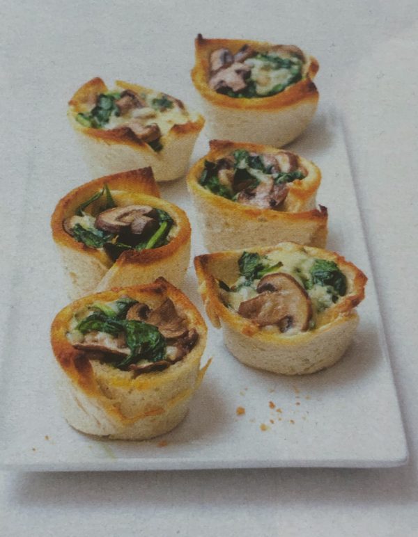 - Na oleji opečeme cibuli, přidáme plátky hub a opékáme 5-8 minut. V míse je pak smícháme se špenátem, polovinou sýru a podle chuti osolíme a opepříme. Formu na muffiny vymažeme máslem a toustové chleby rozválíme dotenka a vyložíme jimy důlky. Na chleby rozdělíme špenátovohoubovou směs, posypeme zbylým sýrem a při 220°C pečeme 7-8 minut.