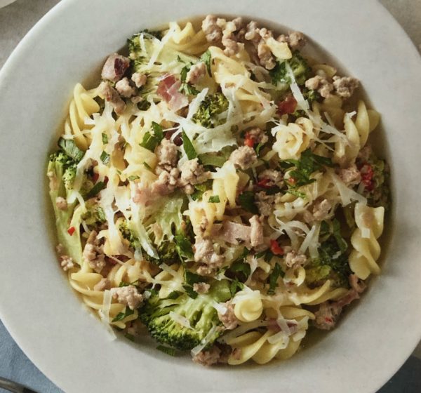 - Do hlubokého talíře naservírujeme porci těstovin s brokolicí a mletým masem. Ozdobíme nahrubo nastrouhaným sýrem.