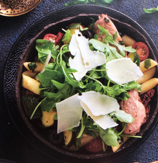 - Nejprve uvaříme těstoviny ve vroucí osolené vodě. Vaříme asi 13 minut za občasného míchání a poté scedíme. Krůtí nudličky omyjeme, osušíme, osolíme, opepříme a opečeme z obou stran v pánvi s rozehřátým olejem. Přidáme na plátky nakrájený česnek a ještě trochu olivového oleje. Jakmile česnek získá zlatavou barvu, přidáme na kousky nakrájenou cuketu. Po krátkém pečení přilijeme vinný ocet, nakonec k masu přisypeme uvařené těstoviny a smícháme. Směs masa s cuketou a těstovinami přendáme do mísy, do které jsme připravili na kousky nakrájená sušená rajčata, na poloviny překrojené olivy a cherry rajčata. Salát promícháme, osolíme, opepříme a přidáme pár kapek olivového oleje a nakrájenou bazalku. Salát servírujeme při pokojové teplotě, případně vychlazený, ozdobený čerstvou rukolou a hoblinkami parmazánu.