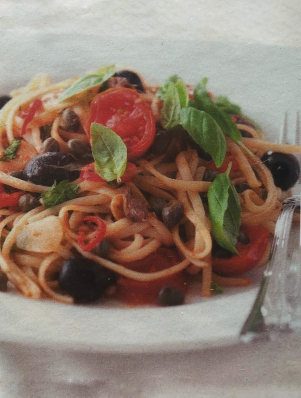- Na středním plameni rozpálíme olej ve velké pánvi s nepřilnavým povrchem. Přidáme česnek a chilli a minutu opékáme. Přihodíme rajčata a za stálého míchání opékáme dalších 5 minut. Přidáme olivy, ančovičky a kapary. Osolíme a opepříme. Servírujeme ideálně na plochých špagetách s bazalkou.