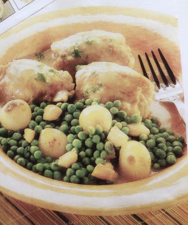 - Cca 10 minut před koncem pečení vyjmeme z omáčky bouquet garni a přidáme hrášek a odložené sádlo s cibulkami. Osolíme, opepříme a vrátíme do trouby.