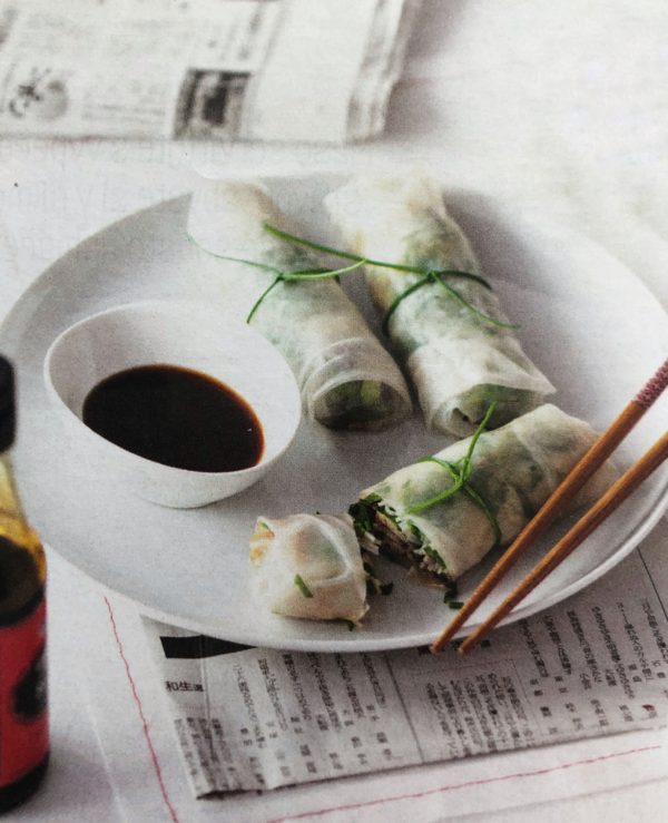 - V míse smícháme hoisin omáčku a ocet. Nudle přendáme do jiné mísy a zalijeme je vroucí vodou. Necháme stát 6-8 minut, aby změkly. Pak je scedíme. Do mísy, jejíž průměr je větší než průměr papíru, nalijeme teplou vodu. Postupně do ní opatrně máčíme rýžové papíry. Necháme je změknout, opatrně otřepeme, položíme na talíř, k jedné straně dáme vždy osminku koriandru, pažitky, salátu, část masa, nudle, pokapeme směsí hoisin omáčky a octa a zarolujeme do závitku. Nakonec každý převážeme snítkou pažitky.