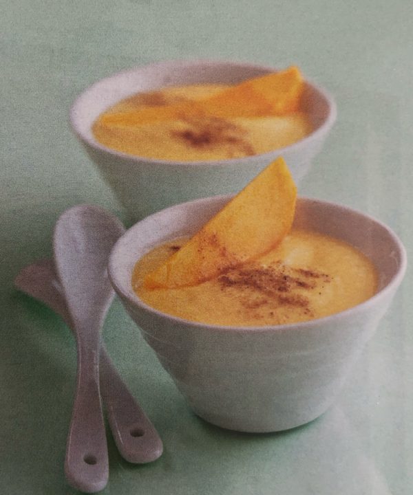 - Dužinu prvního manga nakrájíme na kostičky a spolu s kokosovým mlékem a cukrem rozmixujeme dohladka. Dochutíme limetkovoiu šťávou. Přelijeme do mističek, dáme přes noc vychladit a podáváme ozdobené měsíčky z druhého manga a špetkou kardamonu.