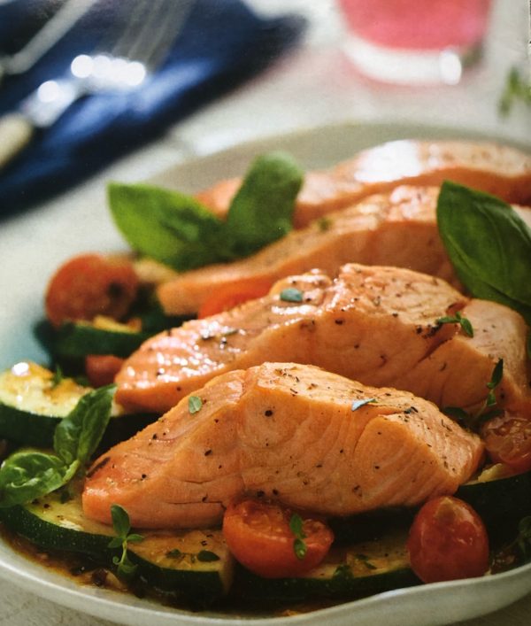 - Na talíř dáme nejdříve cuketové ragú, poté filety z lososa a dozdobíme zbylými lístky čerstvé bazalky. Pokapeme olivovým olejem a osolíme.