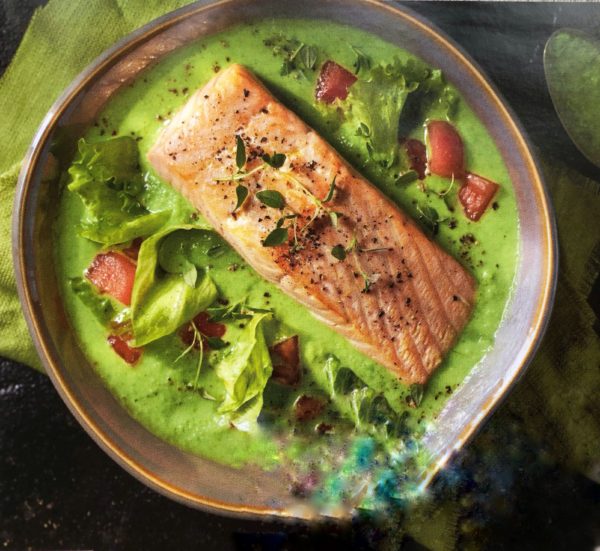 - Na hluboký talíř nejprve dáme dušený ledový salát, na něj položíme lososa a dokola přilijeme hráškový krém.
