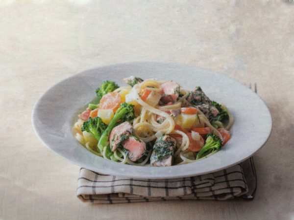 - Nemáme-li napařovací hrnec, vaříme těstoviny samotné a v jiném hrnci napařujte brambory a zeleninu s lososem zvlášť, asi 15–20 minut. Zatím nasypeme kopr na dno velké servírovací mísy. Přidáme přiměřeně měkkého lososa z pařáku a zamícháme, aby se v kopru obalil, pak kousky vrátíme na 2 minuty nad páru. Slijeme těstoviny, v prázdném hrnci zpěníme na másle cibuli, vrátíme do něj těstoviny a přidáme směs s lososem. Ochutíme pár kapkami sójové omáčky, vmícháme opatrně smetanu, aby se kousky lososa nerozdrobily. Na talíři opepříme dle chuti.
