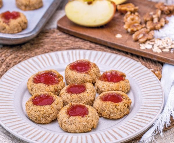 - Do všech kuliček vytvoříme koncem vařečky důlky a plníme je lžičkou jahodového džemu.