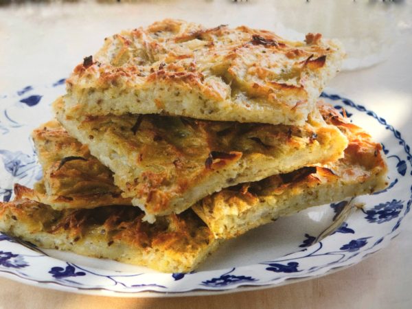 - Pekáč nebo plech vyložíme pečicím papírem, přendáme do něj bramborákovou směs. Pečeme na 180°C v předehřáté troubě dozlatova.