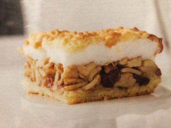 - Všechny bílky vyšleháme do řídké pěny, teprve pak přisypeme cukr a škrob a došleháme v pevný, lesklý sníh. Nakonec zašleháme ocet. Sníh rozetřeme na jablka. Těsto z mrazáku nastrouháme na hrubém struhadle tak, aby část sněhu byla vidět.
