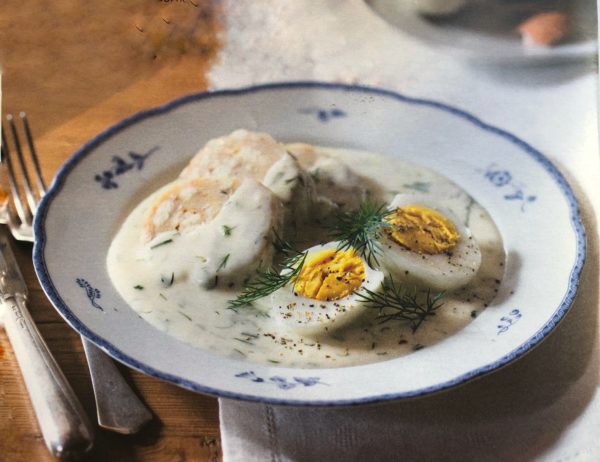 - V hrnci rozpustíme máslo, přisypeme mouku a asi 3-5 minut opékáme do světlé jíšky. Necháme probublávat a pak přilijeme vývar a metličkou promícháme. Přilijeme smetanu a vmícháme kopr. Dotáhneme cukrem, šťávou z citronu, solí a pepřem. Podáváme s vejci a houskovým knedlíkem.