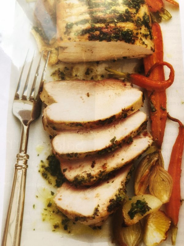 - Krůtí maso na povrchu několikrát nařízneme a do škvír vmačkáme česnekovou pastu. Takto maso necháme zprudka a krátce ze všech stran opéct na jedné lžíci oleje. Dáme do pekáče vyloženého pečicím papírem, potřeme zbylou pastou, polijeme výpekem z pánve, obložíme zeleninou a dáme péct.