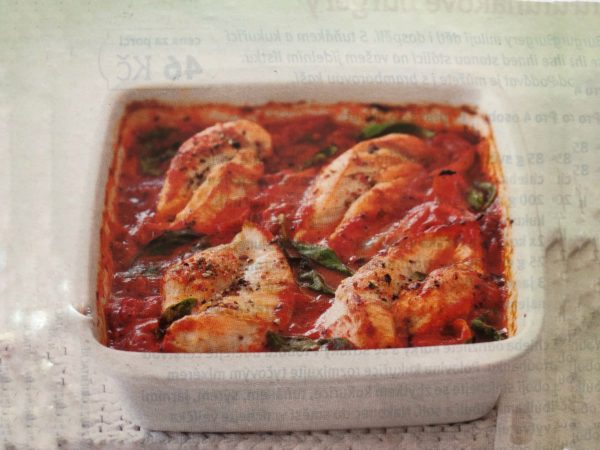- V pánvi na 2 lžících olivového oleje postupně z obou stran dozlatova opečeme kuřecí maso. Pak jej přendáme do zapékací mísy a přelijeme omáčku. Pečeme 25-30 minut, nebo dokud kuře nebude zcela měkké. Podáváme posypané zbylou bazalkou.