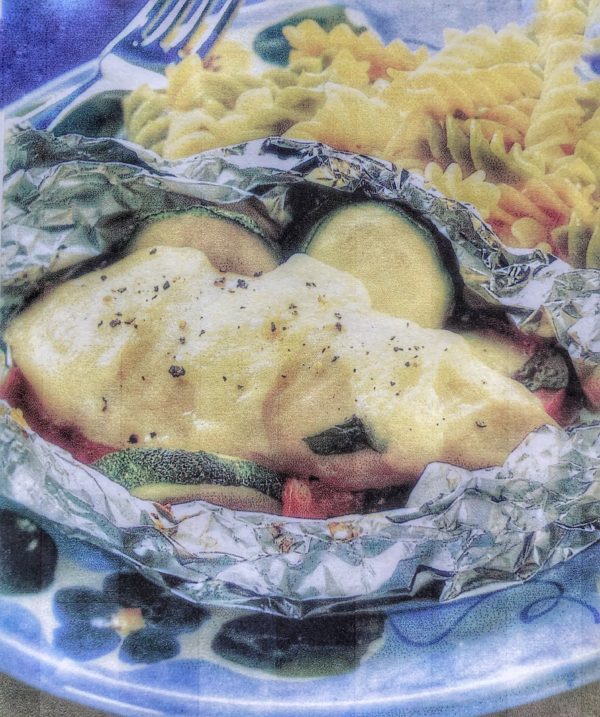 - Cukety a rajčata nakrájíme na kolečka a rozdělíme na čtverce alobalu. Zeleninu osolíme a opepříme. Bazalku nebo oregano nakrájíme nahrubo nebo natrháme a přisypeme je k zelenině v jednotlivých balíčcích.