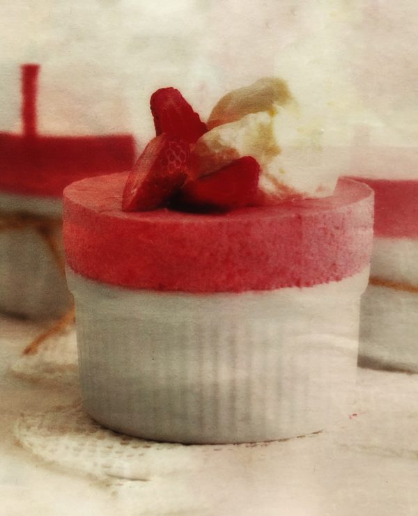 - Půl litru smetany ušleháme dotuha a přidáme k jahodovému pyré. Nádobky, ve kterých bude ledové suflé , obalíme pečícím papírem tak, aby o 5 cm přesahoval okraje, a naplníme je jahodovou směsí. Dáme na 3 hodiny do mrazáku. Vyndáme 20 minut dopředu a podáváme ozdobené ušlehanou zbylou smetanou a plátky jahod.