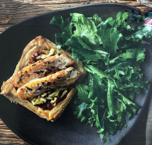 Plát listového těsta nakrájíme na 4 stejně velké obdélníky. Rozšlehaným vajíčkem potřeme okraje listového těsta a přeložíme tak, aby vznikla "vanička". Dovnitř "vaničky" přendáme restovanou cuketu se sušenými rajčaty a navrch položíme 1 až 2 proužky lososa. Okraje těsta potřeme rozšlehaným vajíčkem a dáme péct do předehřáté trouby na 200 °C na 15 až 20 minut.