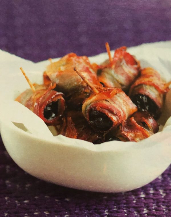 - Vypeckované švestky namočíme do vína s pálenkou a necháme několik hodin marinovat. Plátky slaniny překrojíme podélně na polovinu a každou švestku do jedné zabalíme. Sepneme párátkem a pokládáme na plech s pečicím papírem. V předehřáté troubě pečeme 12-15 minut při teplotě 180°-200°C.