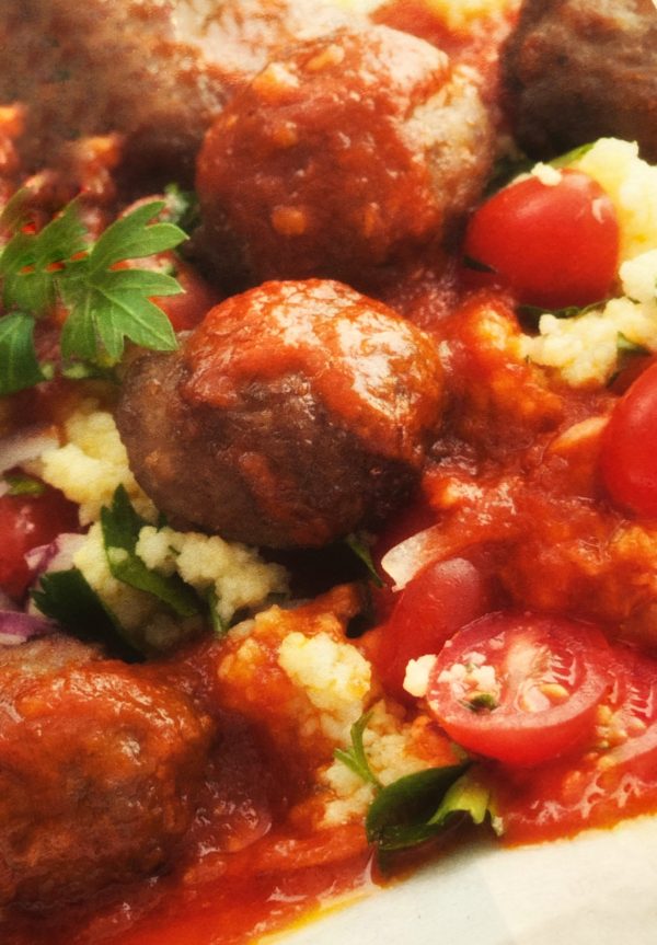 - Do kuskusu vmícháme cibuli, rajčata, jemně nastrouhanou kůru z citronu a petrželku. Ochucený kuskus rozdělíme na talíře, navrch dáme koule a přelijeme omáčkou.