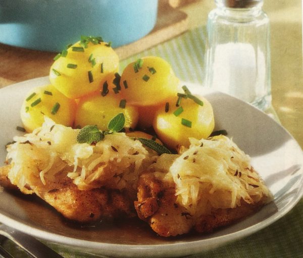 - Na cibuli položíme osolené plátky masa, posypeme je kmínem a podlijeme vodou. Přiklopíme a asi 15 minut dusíme. Na plátky masa pak navrstvíme kysané zelí a vše posypeme nastrouhaným sýrem.