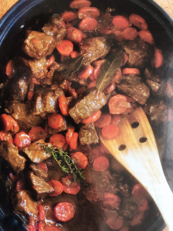 - Troubu předehřejeme na 160°C. Rozpálíme olej v hrnci s pokličkou. V něm opečeme maso ze všech stran, cca 10 minut necháme zatahovat. Potom vyndáme maso a v hrnci opečeme mrkev s cibulí, dokud neztmavnou - pak je posypeme moukou a zamícháme. Maso vrátíme k zelenině i se šťávou, promícháme, podlijeme pivem a přidáme rozdrobenou kostku masoxu. Osolíme, opepříme, přidáme cukr, přidáme bobkový list s tymiánem a pár minut povaříme. Přiklopíme a pečeme cca 2,5 hodiny, dokud maso nezměkne. Podáváme s bramborovou nebo celerovou kaší.