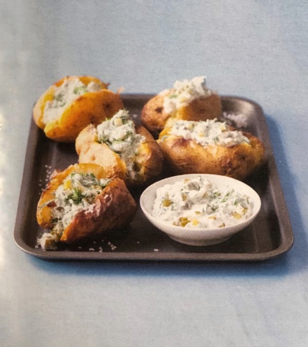 - Brambory omyjeme, osušíme a potřeme olejem. Dáme do pekáče, osolíme, opepříme a dáme na 20-30 minut péct při 180°C. Mezitím v misce našleháme smetanu s jogurtem, přidáme kopr, najemno pokrájené okurky, citronovou šťávu a podle chuti osolíme a opepříme. Upečené brambory rozpůlíme a přelijeme ochucenou smetanou.