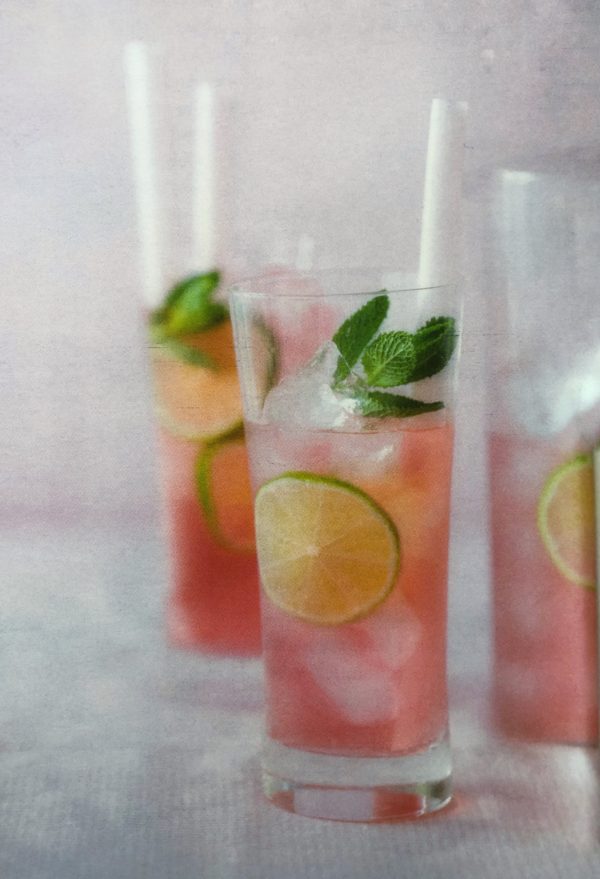 - První 4 ingredience důkladně promícháme. Skleničky naplníme ledem a rozdělíme do nich kolečka limety, zalijeme smíchanou směsí a ozdobíme mátou.