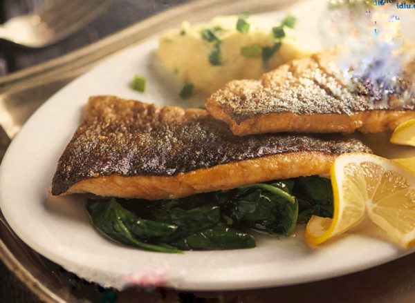 Pstruh se špenátem a bramborami