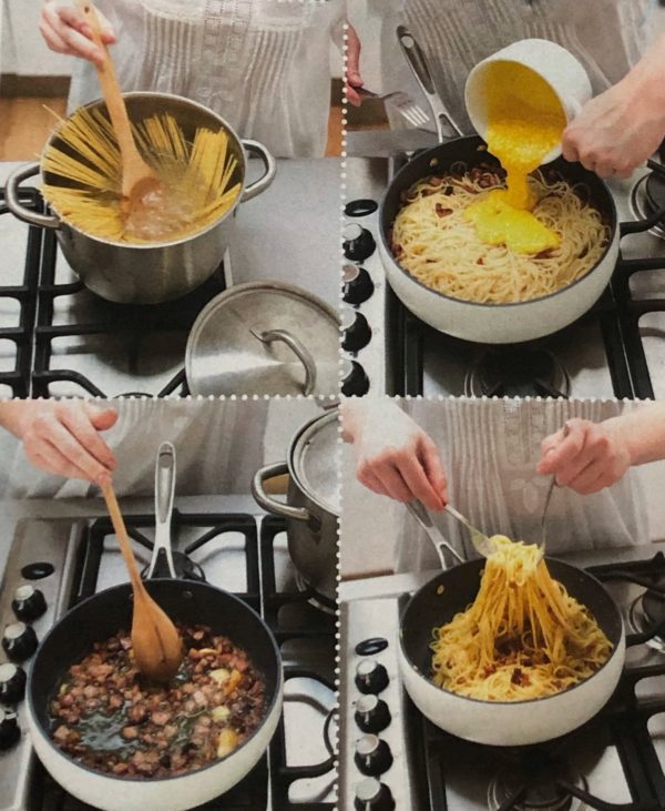 - Pánev udržujeme jen na úplně malém plameni. Vyndáme vařené těstoviny, vodu uschováme. Těstoviny přidáme do pánve. Žloutky prošleháme v misce s většinou sýru a smetany. Pánev s těstovinami sundáme z plotny a přilijeme k nim vaječnou směs.