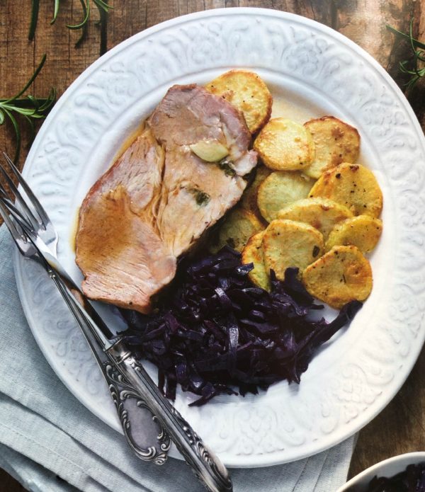 - Na mělký talíř naservírujeme dokřupava upečené brambory, porci dušeného červeného zelí a plátek špikované krkovičky. Celé jídlo můžeme přelít výpekem.