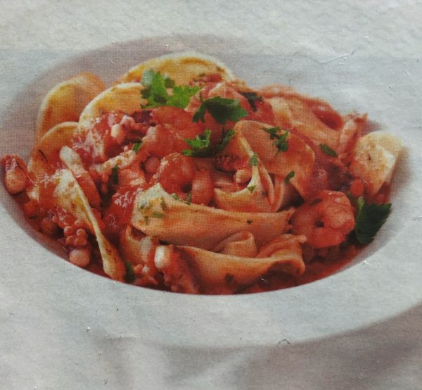 - Olej rozpálíme v pánvi, vsypeme cibuli a česnek. Za stálého míchání opékáme 4 minuty. Přidáme plody moře a zprudka opečeme, aby změkly. Vlijeme víno, povaříme, přilijeme máčku a vývar. Přivedeme k varu, občas zamícháme, dosolíme a smícháme se širokými nudlemi.