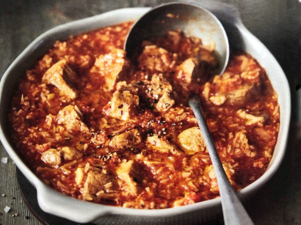 1. Ve velkém hrnci rozpálíme 2 lžíce olivového oleje. Maso osolíme a opepříme a postupně opečeme dohněda. Odložíme ho stranou. Snížíme plamen, do hrnce dáme zbývající lžíci olivového oleje a orestujeme doměkka cibuli. Přidáme česnek, papriku a chilli vločky a zhruba 1 minutu mícháme, dokud se koření nerozvoní. Rajčata rozmačkáme a přidáme do hrnce spolu s polovinou vývaru. Promícháme, přidáme maso i se šťávou, kterou pustí, a přivedeme k varu. Snížíme plamen a necháme zvolna vařit 30-40 minut, až maso změkne.