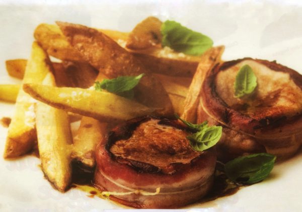 - Medailonky osolíme, opepříme, po obvodu omotáme slaninou a převážeme provázkem. Na pánvi rozpálíme dvě lžíce oleje a zprudka na něm opečeme maso - mělo by to trvat cca 3-5 minut z každé strany. Ze zbylého oleje, octa, hořčice, česneku a špetky soli ušleháme omáčku a tou teplé steaky polijeme na talíři. Nejlepší podávat s domácími hranolky.
