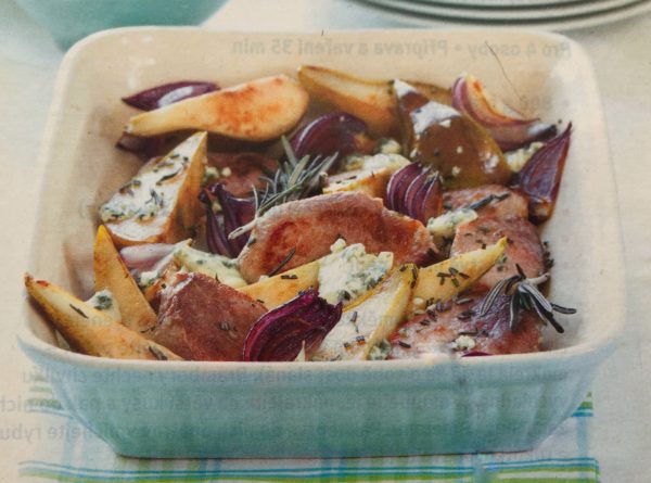 - olej rozpálíme na pekáčku, přidáme cibuli, hrušky, většinu rozmarýnu a sůl. Opékáme 5 minut, dokud směs nezačne karamelizovat. Pustíme troubu na vyšší stupěň, maso lehce naklepeme, osolíme, přidáme k zelenině a opékáme 5-10 minut z obou stran, dokud nezezlátne a nezměkne. Posypeme sýrem a dáme do trouby nebo pod grill na 5-10 minut, aby se sýr rozpustil.