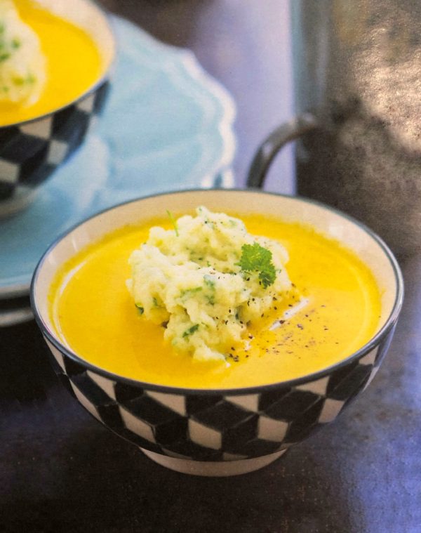 - Upečenou zeleninu přesuneme do mixéru, přidáme třetinu vývaru a rozmixujeme dohladka. Vrátíme do hrnce, přidáme zbytek vývaru a smetanu a přivedeme k varu. Vložíme knedlíčky a vaříme 6-8 minut.