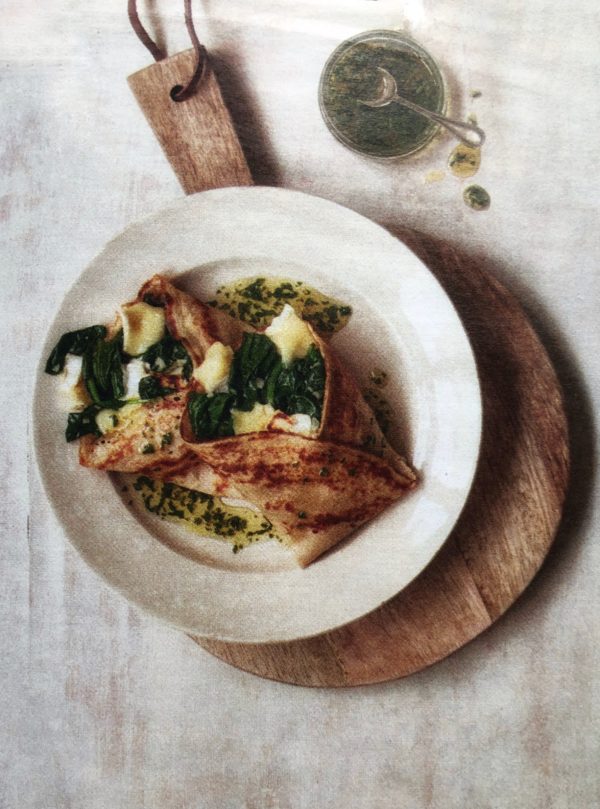 - Smícháme suroviny na těsto a opečeme palačinky. Na náplň rozehřejeme olej, přidáme česnek, špenát a necháme zavadnout. Dochutíme, vmícháme parmazán a vše přendáme do mísy. V rendlíku prohřejeme med a olej. Do pánve vložíme palačinku, na čtvrtku dáme pár plátků sýru, trochu špenátu a navrch sýr. Složíme ji na trojúhelník a z obou stran prohřejeme. Přelijeme omáčkou s petrželkou a máslem.