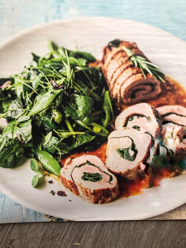 Roláda z vepřové panenky s dušeným špenátem a hráškem