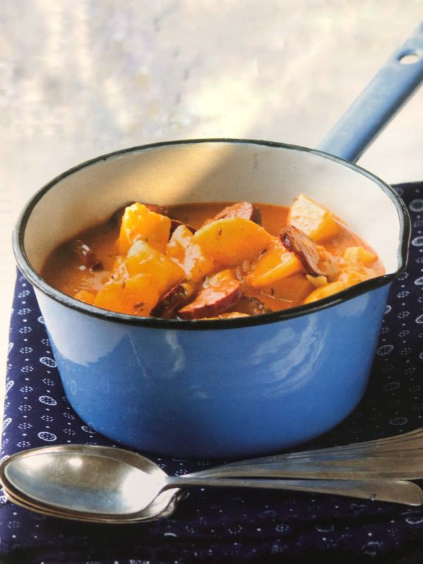 - Na oleji osmahneme cibuli, přisypeme papriky, kmín, česnek a krátce osmahneme. Pak zalijeme litrem vody a přidáme brambory, osolíme a vaříme, aby byly skoro hotové. Přidáme mouku rozmíchanou v troše studené vody a vaříme dvacet minut. Pak přidáme uzeninu, dochutíme pepřem a majoránkou a před podáváním ještě chvíli povaříme.