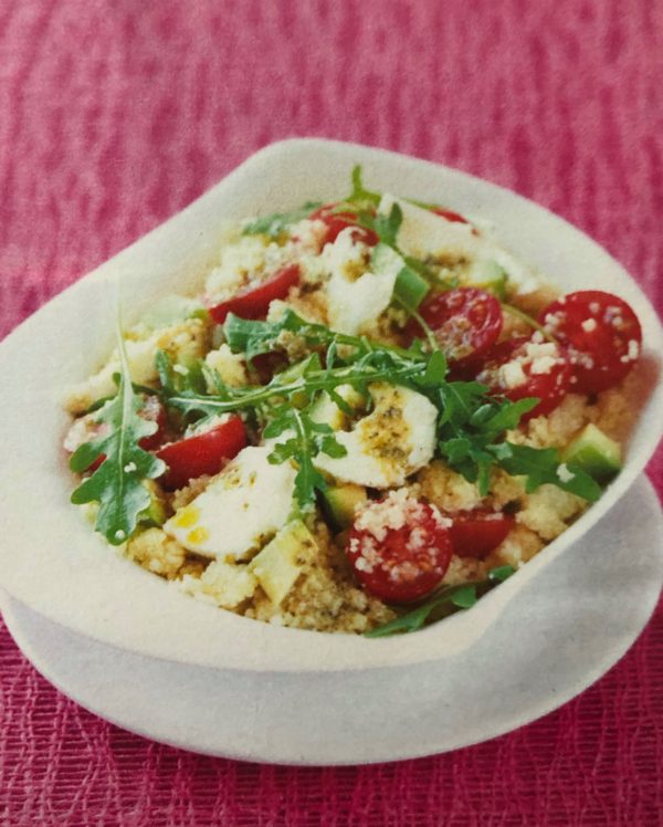- Kuskus zalijeme vařícím vývarem, přikryjeme a necháme 10 minut odstát, dokud nezměkne. Smícháme přísady na dresing a pak jej vmícháme do kuskusu. Nakonec přidáme i zbývající ingredience, jemně promícháme a navrch poházíme lístky rukoly.