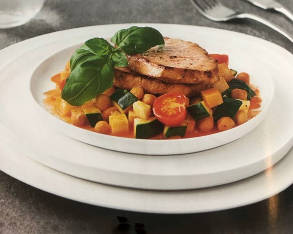 - Pečené maso podáváme s cizrnovým ragú a připravenou cuketou a cherry rajčaty.