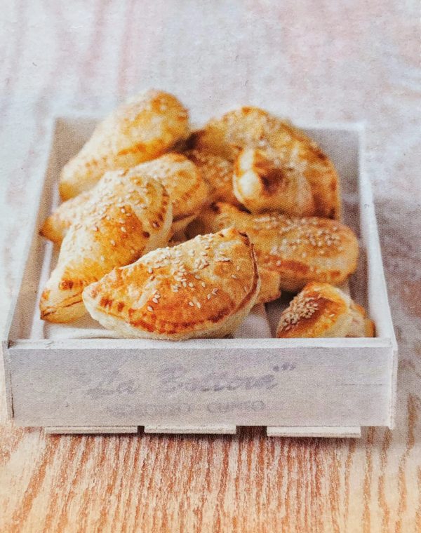 - Smícháme sýry, šalotku, tuňáka, sůl a pepř, citronovou kůru a nasekaná sušená rajčata. Listové těsto rozválíme na pomoučněném válu a vykrájíme z něj středně velká kolečka. Do středu každého dáme 2 lžíce tuňákové náplně a přeložíme. Konce pevně přimáčkneme k sobě, kapsy potřeme vajíčkem, posypeme sezamem a dáme na 15 minut péct do trouby předehřáté na 180°C.