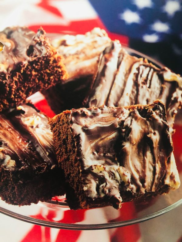 - Připravíme si polevu: hořkou a bílou čokoládu nasekáme nahrubo a posypeme jí ještě teplý korpus. Nakonec polevu rozetřeme tak, aby vzniklo nepravidelné mramorování. Moučník položíme na mřížku a necháme jej vychladnout. Poté jej nakrájíme na kostky.