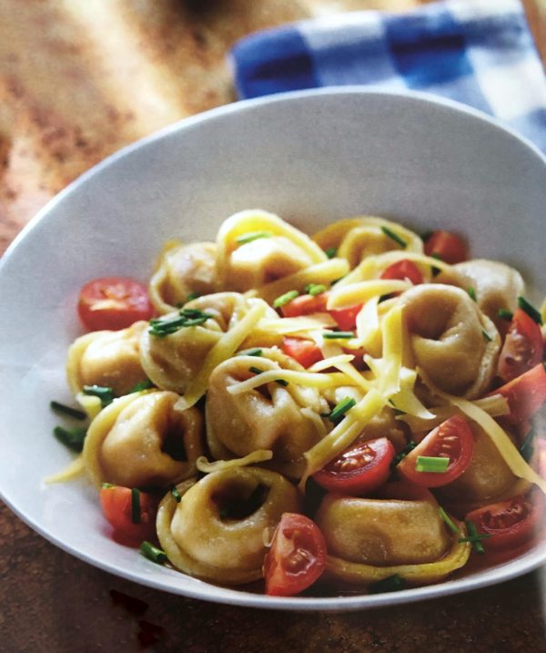 - Na hluboký talíř dáme tortelinky s cherry rajčátky a máslovou omáčkou. Posypeme většími kousky pažitky a nastrouhaným ementálem.