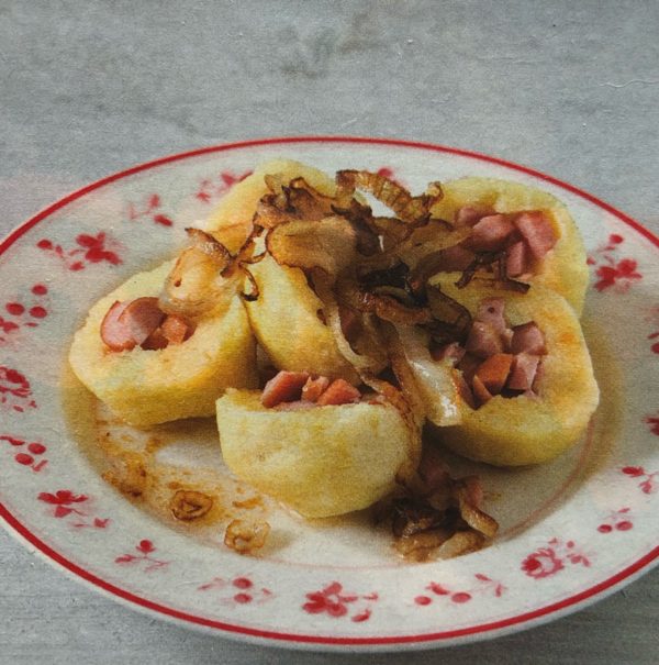 - Brambory uvařené ve slupce oloupeme a vychladlé jemně nastrouháme. Přidáme mouku, sůl a vajíčko a vypracujeme hladké těsto. To rozdělíme na kousky, za každého uděláme placičku a do ní zabalíme kousky párků. Zamotáme. Knedlíky vaříme 10 minut v osolené vodě. Na oleji dozlatova osmahneme cibulku a tím ozdobíme hotové knedlíky.