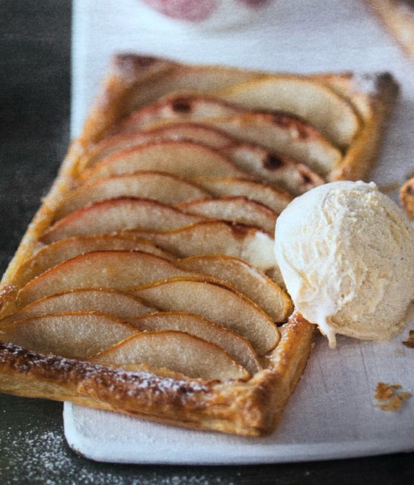 - Máslo smícháme s cukrem, zázvorem, extraktem a skořicí. Směsí potřeme těsto a doprostřed vkládáme plátky hrušek. Střídáme je za sebou tak, aby širší část byla jednou vlevo, jednou vpravo a vytvořili zdání vlny. Hrušky potřeme zbylou máslovou směsí a posypeme dalším cukrem. Pečeme 15-18 minut nebo dokud těsto nezezlátne. Podáváme se zmrzlinou nebo dotuha ušlehanou smetanou.