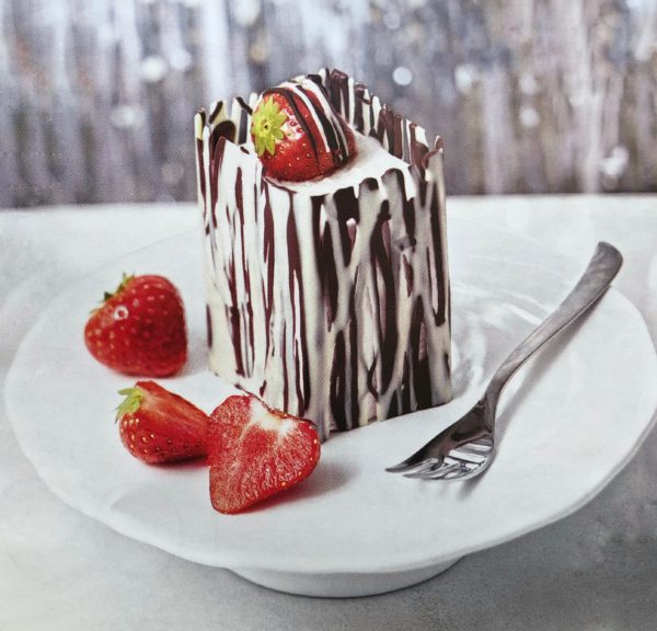 - Na celý povrch jednoho korpusu rozprostřeme 2/3 krému, zakryjeme připravenými jahodami, přiklopíme druhým korpusem a vložíme do lednice na 3 hodiny. Mezitím připravíme ozdoby z čokolád. Bílou i hořkou čokoládu rozehřejeme zvlášť ve vodní lázni a poté přelijeme do cukrářských sáčků s malými otvory. Pruh pečicího papíru (o délce obvodu jedné porce - kostky - a výšce o 1 cm vyšší) položíme na šířku a čokoládou na vaření vytváříme od horního ke spodnímu okraji po celé délce papíru první vrstvu. Stejný postup použijeme na tentýž papír s bílou čokoládou. Poté necháme chvíli „zatuhnout“, aby čokoláda nestékala. Jednotlivé řezy nejprve celé potřeme krémem, poté obalíme do čokoládové ozdoby a vložíme na chvíli do mrazáku. Po chvíli odstraníme pečicí papír. Navrch každého řezu položíme jahodu, kterou můžeme také dle fantazie ozdobit.