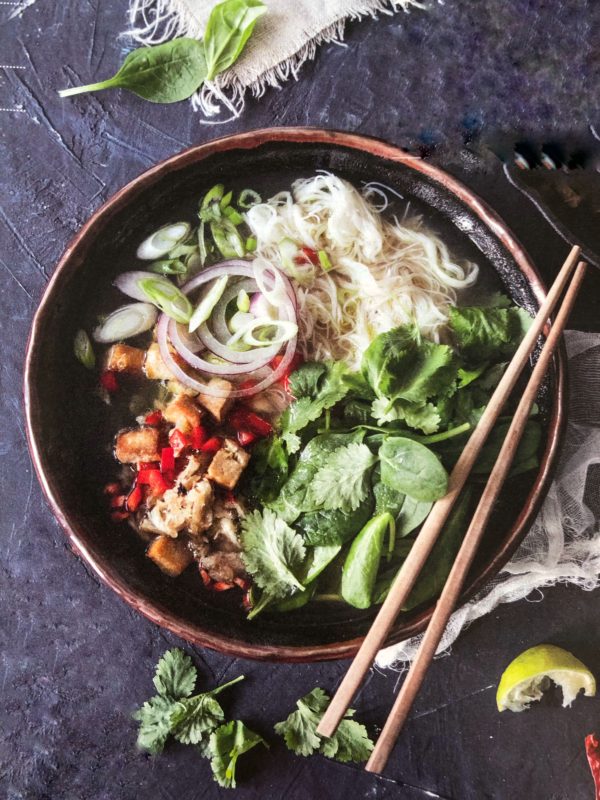- Na talíře rozdělíme maso s tofu, špenát, jarní cibulku, chilli, koriandr, zázvor a uvařené nudle. Zakapeme šťávou z limetky. Vše přelijeme vývarem a podáváme.