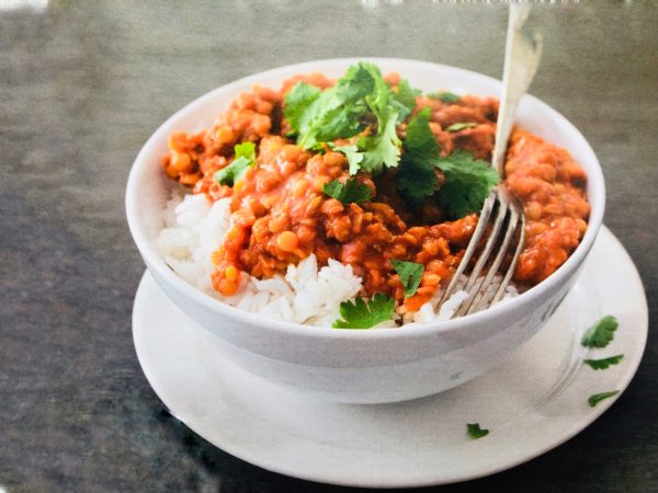 - Poté vmícháme protlak a chvíli dusíme. Přidáme čočku a kokosové mléko. Dusíme dalších 15-20 minut. Podáváme s rýží dozdobené koriandrem.