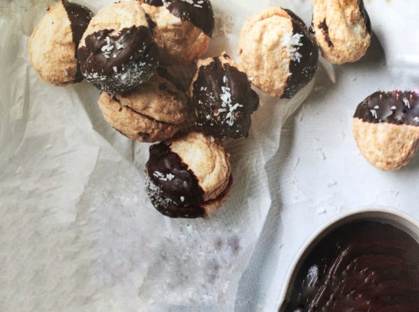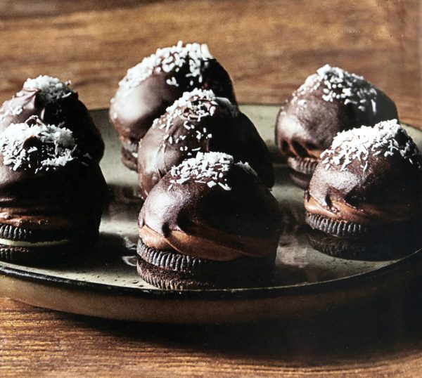- V míse vyšleháme sníh z bílků, opatrně vmícháme moučkový cukr a kokos. Poté těstem naplníme cukrářský sáček a na plech vyloženém pečicím papírem vytvoříme kolečka o průměru asi 5 cm. Aby byla kolečka rovná, lehce klepneme plechem. Pečeme dozlatova v troubě předehřáté na 150 °C asi 10 minut. Než kolečka vychladnou, rozpustíme ve vodní lázni čokoládu. Vždy jedno kolečko natřeme na rovné straně čokoládou a slepíme s druhým kolečkem. Položíme na pečicí papír a necháme ztuhnout. Poté kolečka namočíme do poloviny v čokoládě a ozdobíme kokosem.
